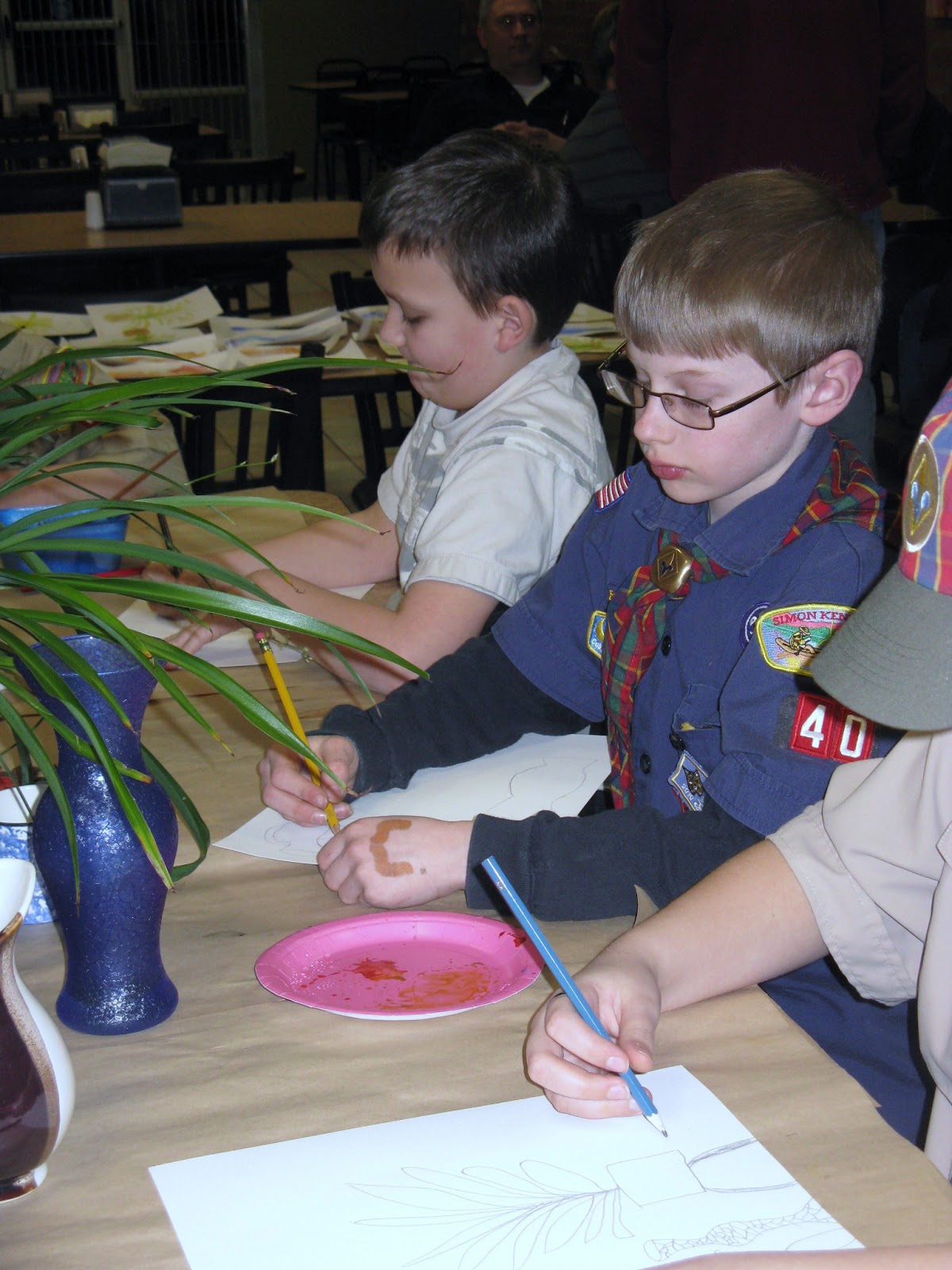 Tonight the weather is changing ...the snow is returning but I had a warm evening with my beloved Weblos. They have now completed their badge requirements for their Art badge to be presented on March 16 at a local church dinner party. I gave them all a baby spider plant...they were fascinated by the off shoots...and so they all wanted to try to grow one at home. I am totally exhausted but I do believe they had a great time...honestly I think just playing with paints is enough of a lesson.